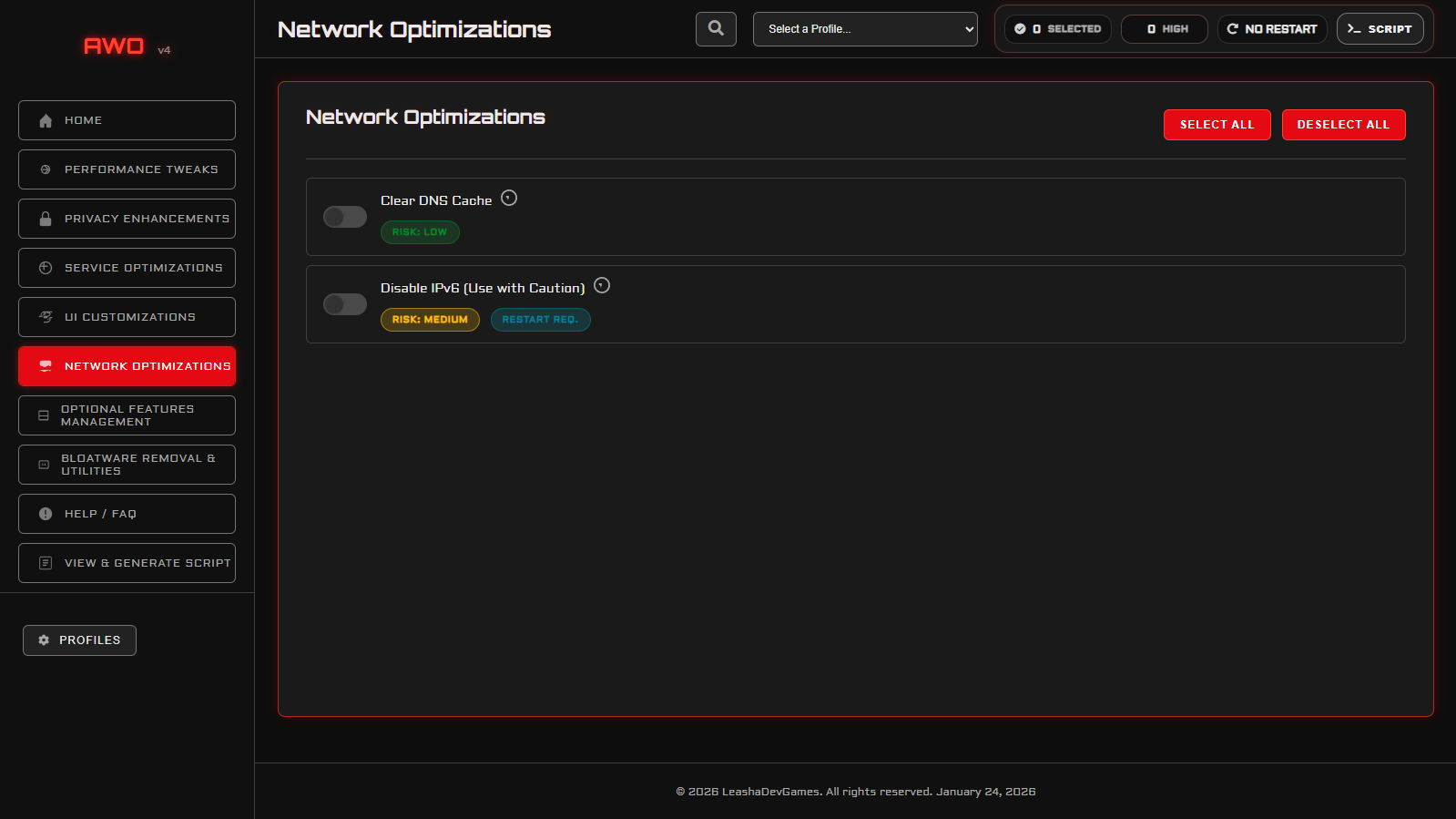 Each tweak includes a simple explanation and risk level, so you always know what you're enabling.