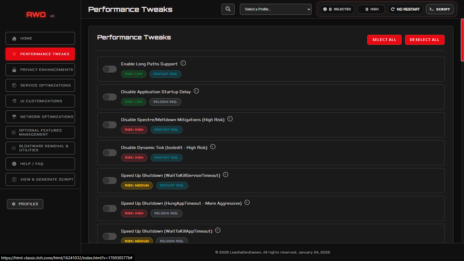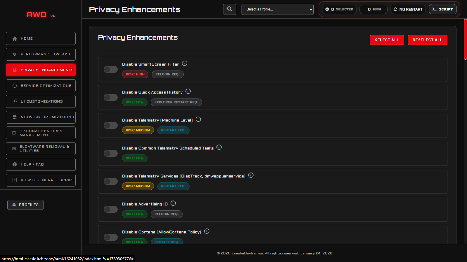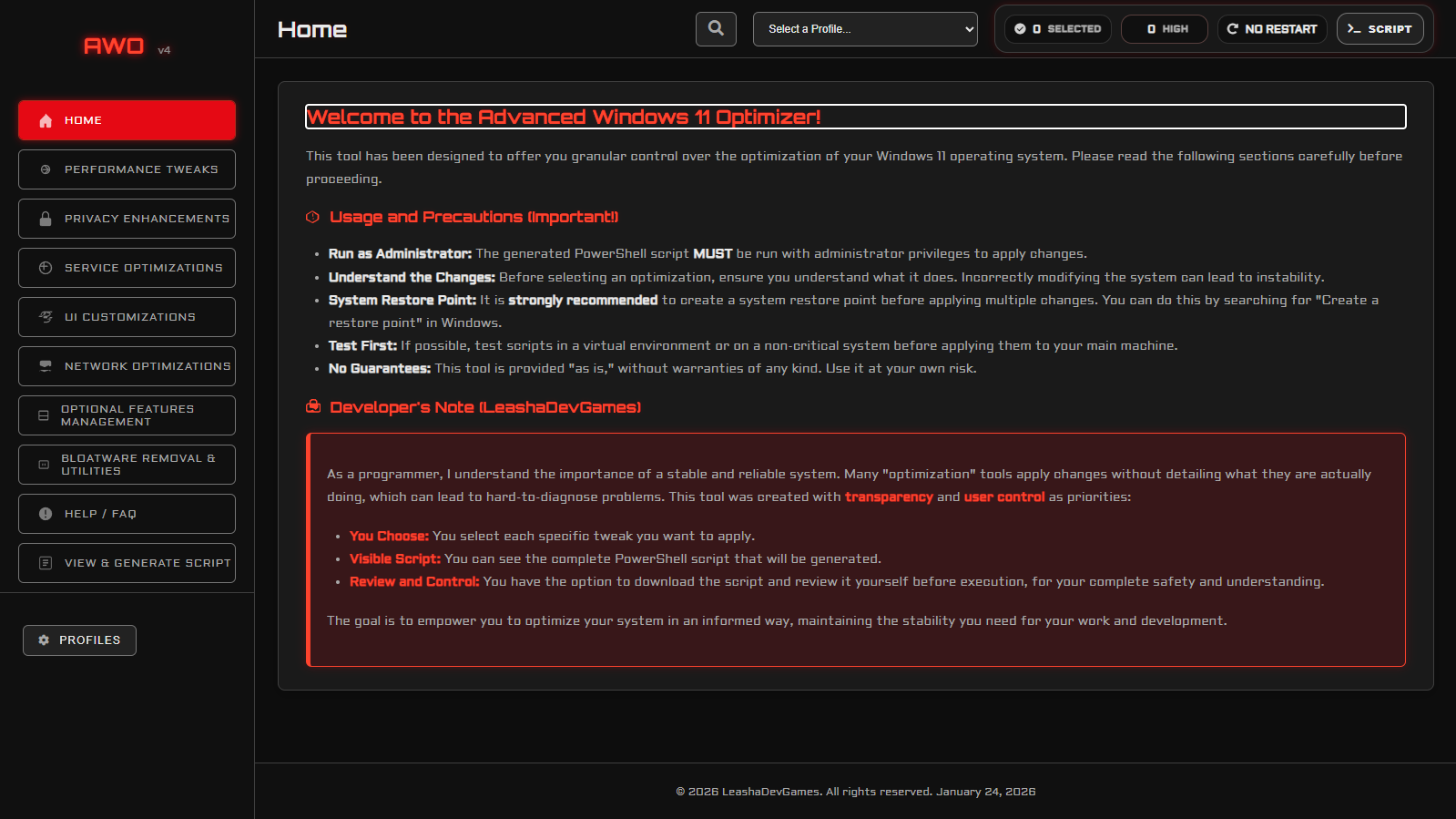 Boost performance, improve privacy, remove bloatware, and generate safe PowerShell scripts with full transparency.